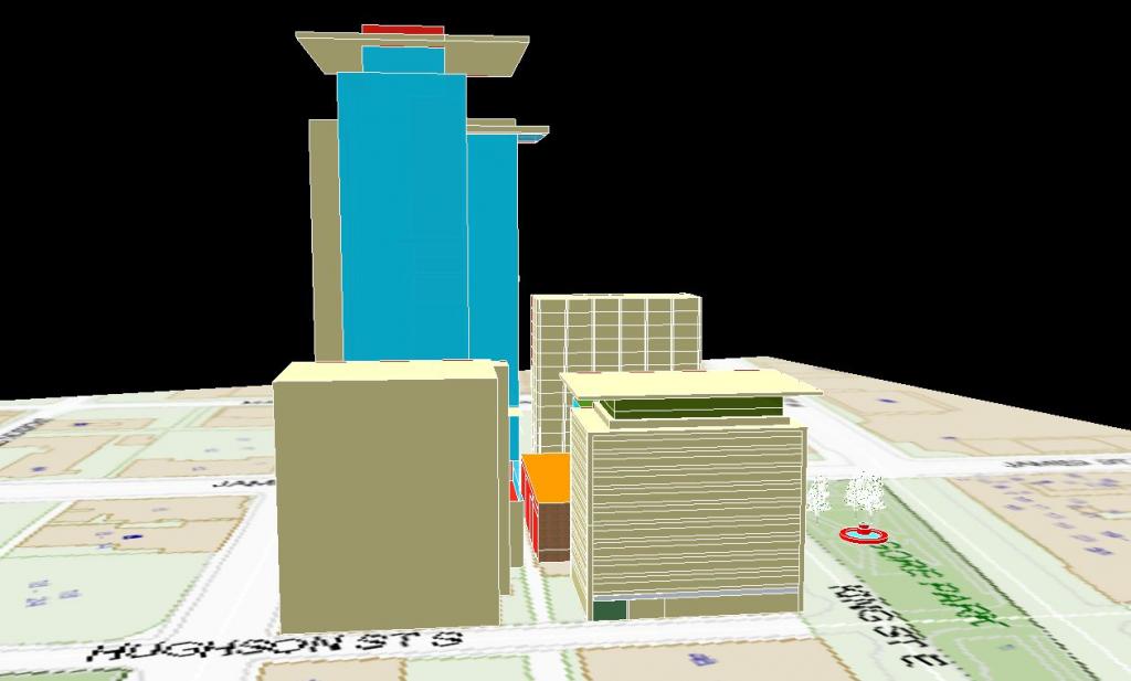 The proposal suggests a phased plan with three stages. The first stage is to develop an 80-room boutique hotel superimposed on top of the Gore Park row of heritage buildings in a receding form. The receding levels open up the sightline for 50% of the units in phases two and three, while also providing Gore Park with low shadow cover from the buildings.