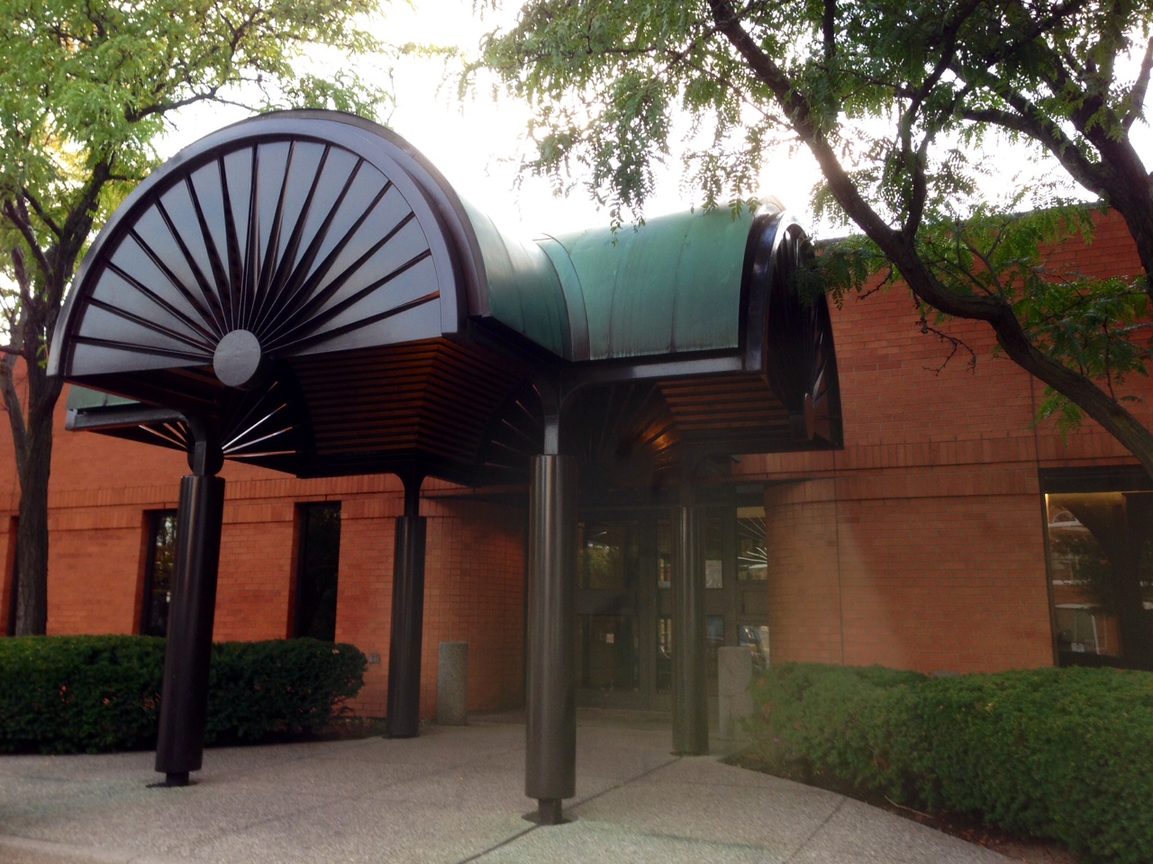 A three sided semi-circular copper-roofed canopy covers the entrance located on Ray Street. The parapet is also clad with now oxidized copper, adding another striking visual touch to the building’s exterior.