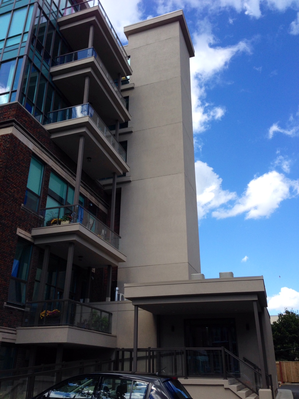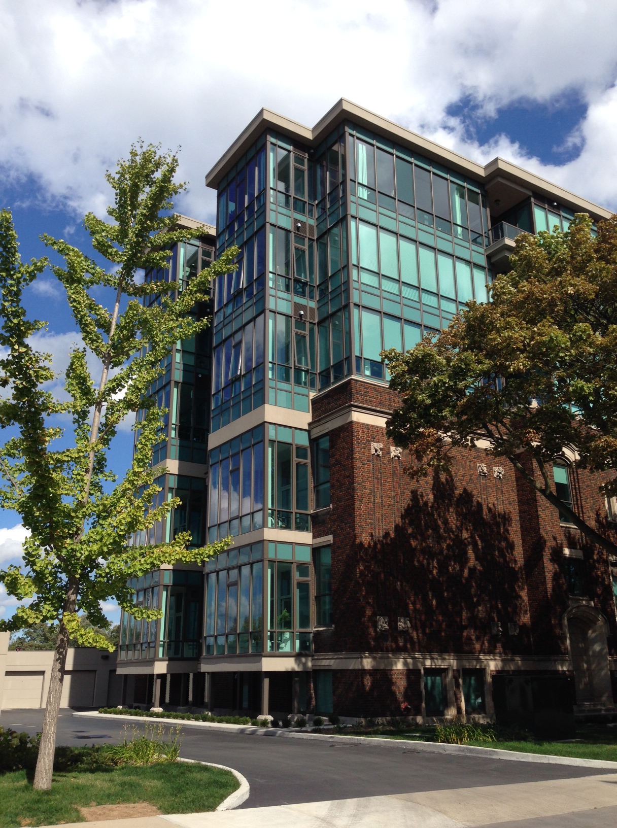 Completed in 2013, the five-storey, 36-unit loft is a catalyst for redevelopment in the core. The design of the building effectively incorporates and preserves the two-storey school from 1925, while a three-storey emerald jewel box of glass and steel is superimposed on top of the neo-Romanesque building. The outcome is a harmonious marriage of contemporary and classical architecture. image-18 New entrances have been relocated to the east side of the building, where an elevator has been added for accessibility to the upper floors. image-20 Two additional entrances are also located at the rear of the building under original arched doorways. image-21 The schools façade has largely remained unchanged with its detailed limestone ornament and intricate, colourful brickwork. The only changes being cosmetic and structural upgrades, such as pot lights and new windows.