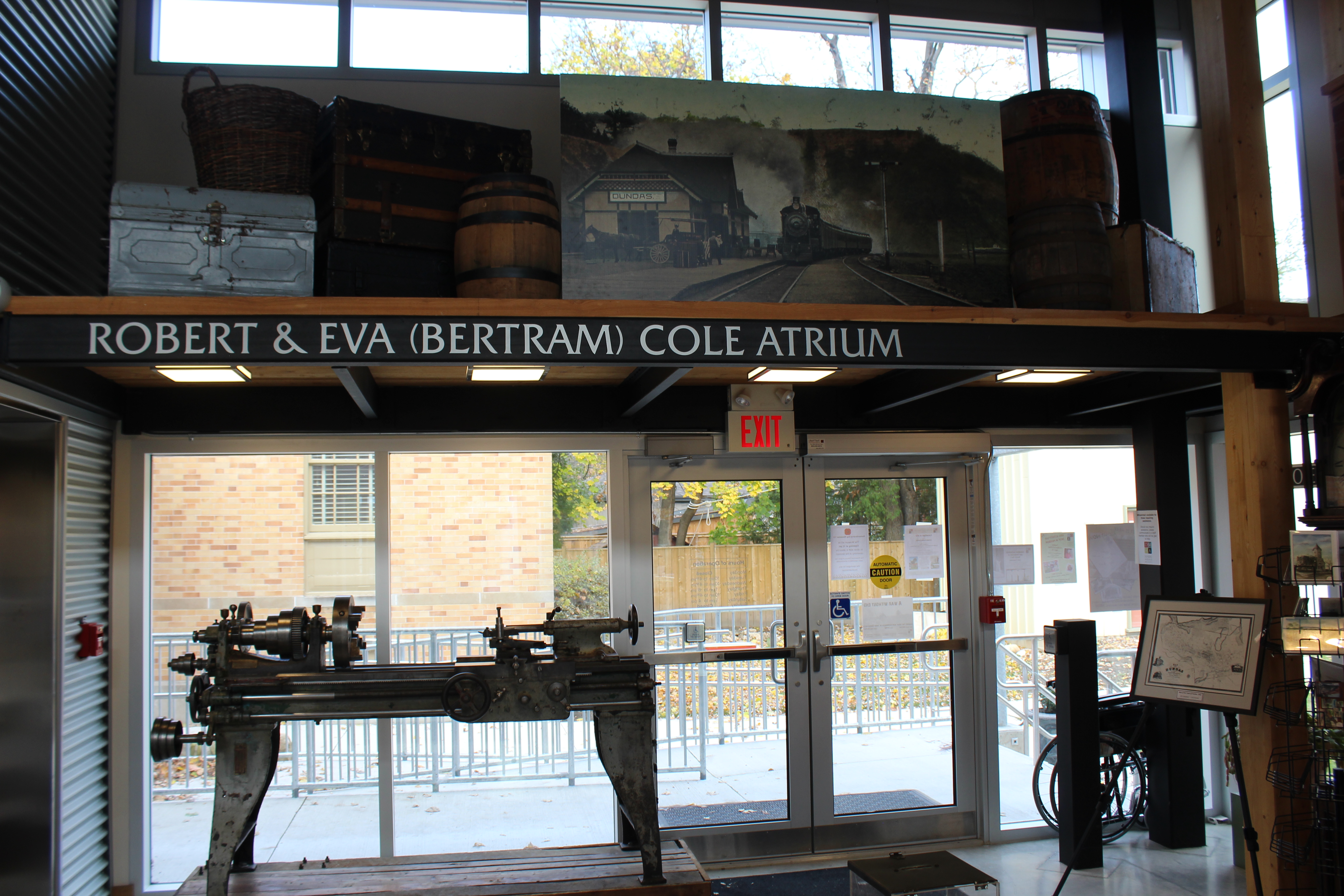 The double-height atrium, named Robert & Eva (Betrum) Cole Atrium (after the family of the Dundas Museum founder H.G. Bertram), features exposed beams, celestial windows, corrugated steel cladding, and an area to display artifacts like the machine lathe that was built by John Bertram and Sons Co. in 1896. “I bought it on Kijiji!” boasts Puddister, with a smile.