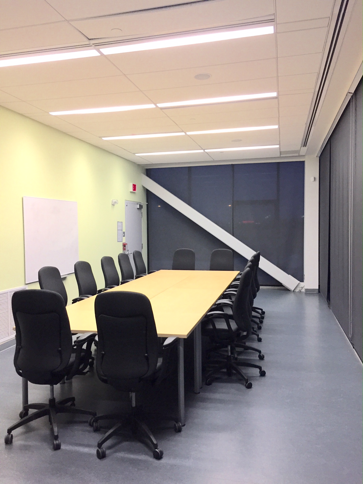 The interior is the opposite of imposing. It’s warm, functional, and sleek, with many contemporary touches. The first floor is outfitted with modular sofas, plastic covered backless benches for viewing, even coloured tubular garbage cans. There’s also a small boardroom at the southeast corner, surrounded by windows and exposed structural columns.