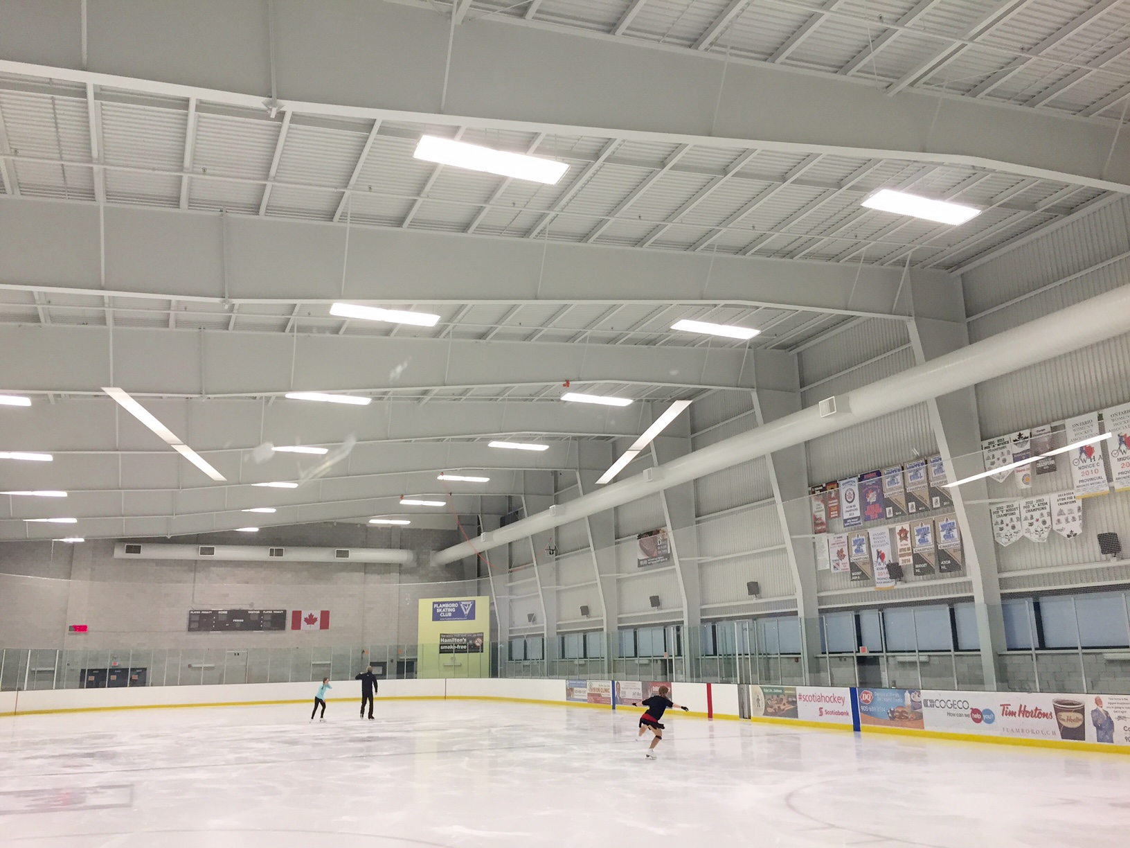 Inside the rink space, the pre-engineered steel framing is exposed with a non-traditional rigid frame. The H-beams line the ceiling and wall of the rinks, angling and dropping against the load bearing metal sheets like the legs of an arachnid.