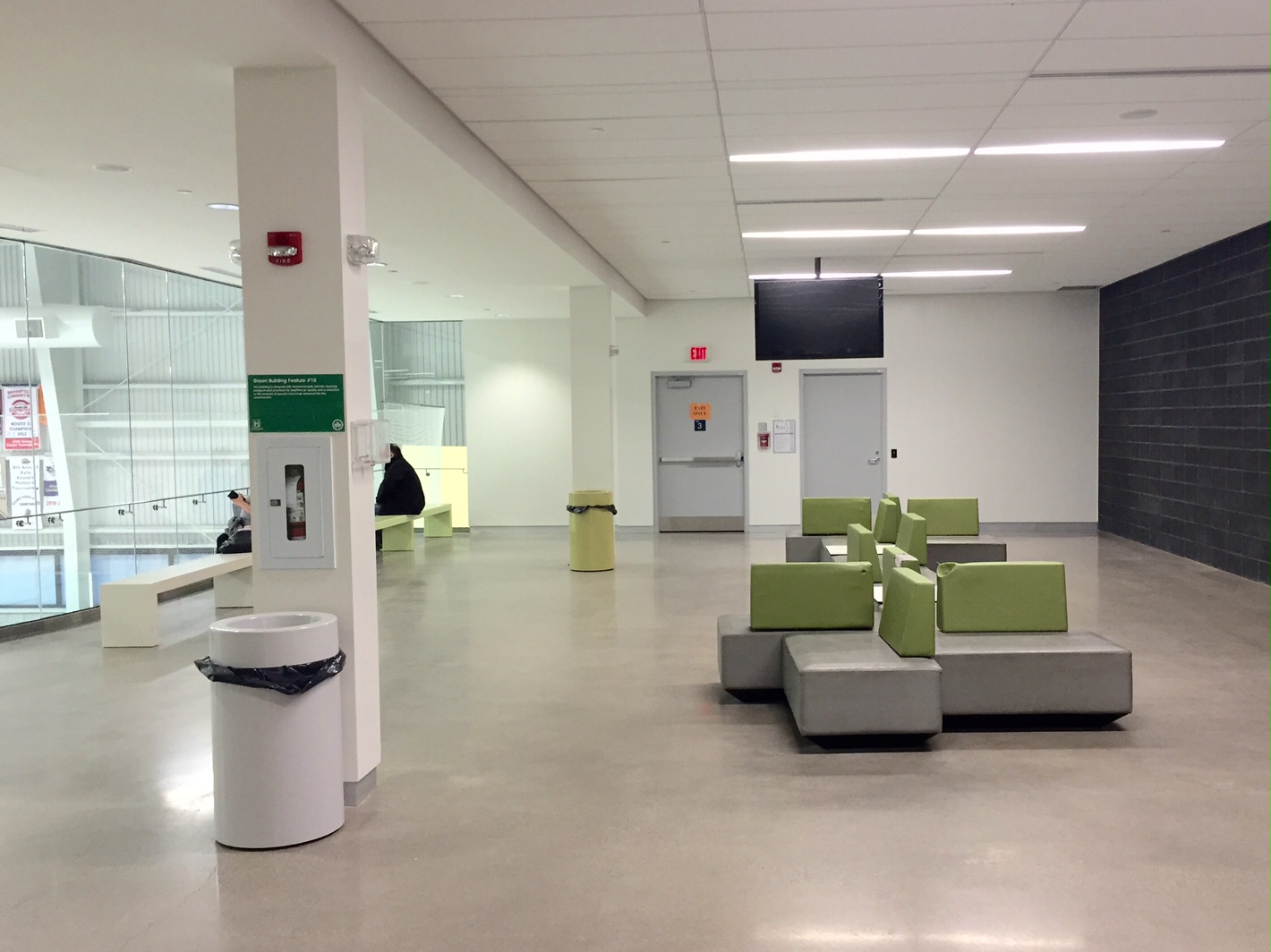 Throughout the building, the columns and walls have informative plaques highlighting the environmental and sustainable features, which awarded this building LEED Silver status.