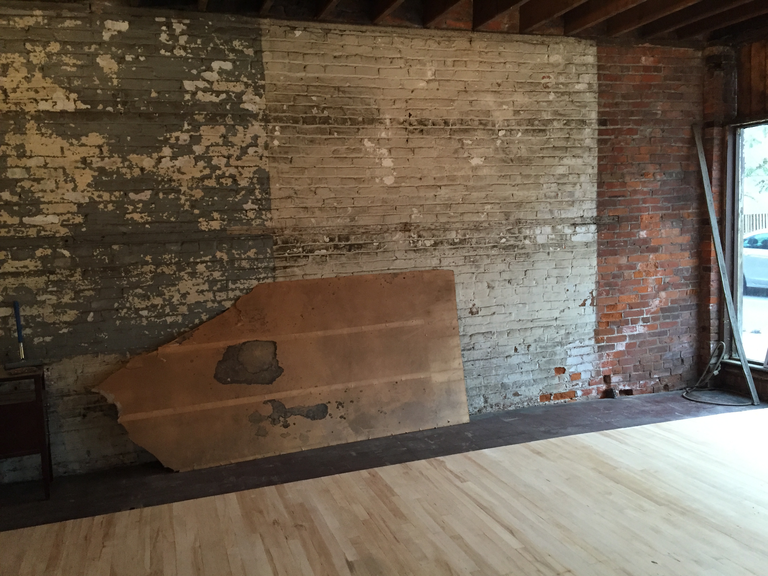Jeff Feswick, owner of Historia Building Restoration Inc, bought the building in 2010 and has uncovered layers of history hidden in the floors and walls. The interior has been gutted, exposing the framing and joists, save for a few walls with patches of peeling wallpaper. The space has sat unused for decades, until now.